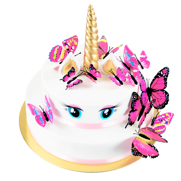 Wunderschöne blaue Augen strahlen Sie an und auf dem Einhornkopf thront ein Gold schimmerndes Horn, das sich spitz nach oben windet, links und rechts davon süße Öhrchen. Zahlreiche pinke Schmetterlinge haben es sich auf der Einhorn Torte bequem gemacht - ein paar Begleiter aus dem Zauberwald, der Heimat des Einhorns. Mit unserer Einhorn Torte erhalten Sie neben dem Goldenen Horn, den Öhrchen und den Schmetterling Steckern, die sich beliebig auf der Torte arrangieren lassen, auch noch ein Satinband in Rosa, das der Einhorn Torte einen passenden und eleganten Abschluss verleiht.